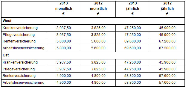 Ab 1. Januar 2013 gelten voraussichtlich folgende Werte in der Sozialversicherung: